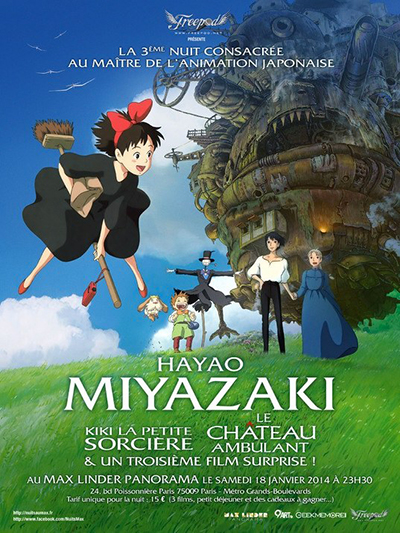 Le cinéma Max Linder Panorama à Paris organise une 3e édition de la Nuit Miyazaki du 18 janvier 2014, à partir de 23 h 45, jusqu'au 19 janvier 2014, 8 h 00.