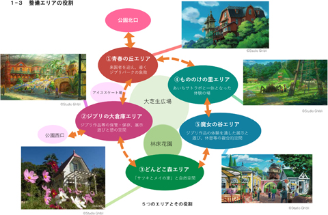 Zone 5 : La vallée des sorcières (environ 27 000 m2) qui proposera des bâtiments grandeur nature tirés des films Le château ambulant, Kiki, la petite sorcière mais aussi des installations de divertissement comme un mini parc d'attraction.