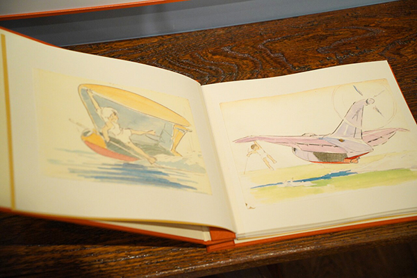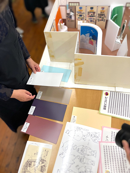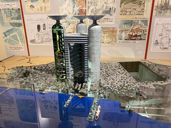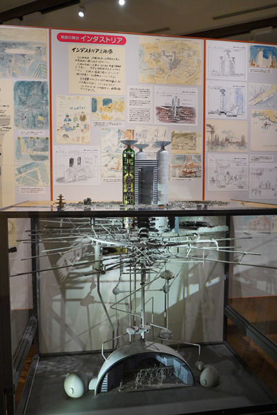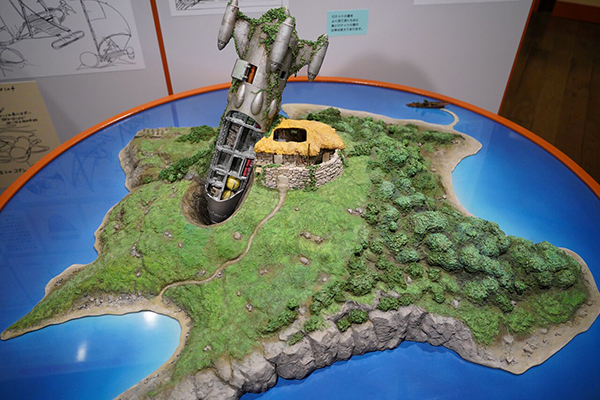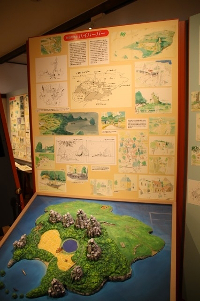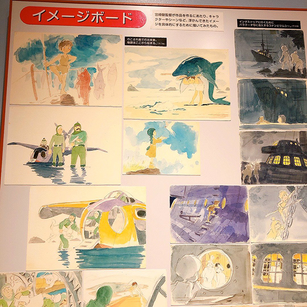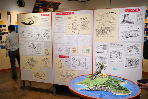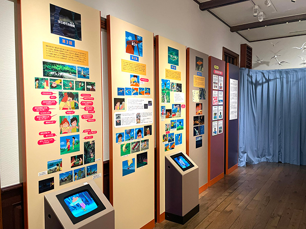 Les maquettes sont accompagnées de panneaux résumant les épisodes, ou illustrés d’éléments de production et de dessins de Miyazaki, et d’écrans proposants des scènes de la série.