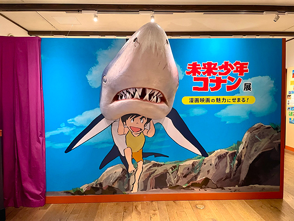 En entrant dans la première salle d'exposition, le visiteur est accueillit par l’affiche de l’exposition d’où surgit la tête tridimensionnelle du requin que Conan vient d’occire au début de la série. Suivent une maquette de 120 cm du Barracuda, de l’île perdue, de la tour triangulaire d’Industria et de la machine volante du docteur Raoh, ainsi qu’une réplique grandeur nature du robot du capitaine Dice.