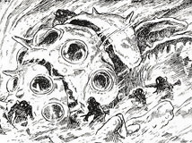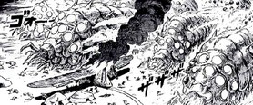 Lors d’une pause près des lacs acides, les troupes Tolmèques tombent dans un piège tendu par les Dorks, grâce à des renseignements fournis par un des frères de Kushana, prêt à tout pour l’éliminer. Malgré l’usage de commandos-suicides et une charge virulente d’Ômu, leur stratégie échoue, notamment grâce à l’intervention de Nausicaä. Non loin de là, des maîtres-vers, pourtant affiliés au royaume Tolmèque, trahissent ce dernier et monnayent avec les Dorks pour leur fournir des Ômu élevés en captivité.