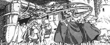 La population est peu élevée, à peine 500 personnes de l’aveu de Jill. Elle vit toute entière dans un gros château ressemblant à une termitière. Leur société est fondée sur l’agriculture et semble peu avancée technologiquement, en dehors de l’usage du Gunship. Ce dernier date d’une centaine d’années et sa technologie a été perdue. C’est le seul exemplaire restant. Nausicaa possède également un Moeve, petit planeur monoplace doté d’un moteur.
