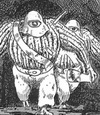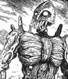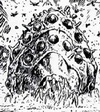 Ces êtres mutants à la solde de l’empereur Dork sont des créations du cimetière de Shuwa. Ils sont d’une taille supérieure à l’homme. Ils ont une peau ressemblant à un cactus et une attitude évoquant le singe. Leur bouche se situe en haut de leur crâne et ils sont nourris de cadavres par de gros entonnoirs. Ils obéissent aux sons émis par leurs maîtres Dorks. Dotés de trois yeux, ils portent un casque où est représenté un œil unique, symbole de l’empire Dork, qui cache en réalité un étau piquant qui les torture sans cesse. Ces mutants sont immortels, sauf si l’on détruit leur centre névralgique, qui se trouve dans l’œil central. |