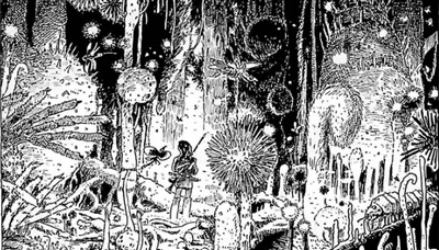 La forêt est un éco-système complexe rempli de bactéries géantes où seuls vivent les insectes et quelques hommes, protégés par des masques. Elle se répand peu à peu grâce à des spores véhiculées par l’air. Celles-ci s’implantent dans le sol et s’y enracinent. Les plantes, appelés Mushigoyashi (« engrais pour insectes »), grandissent grâce à la photosynthèse et peuvent atteindre jusqu’à 50 mètres de haut. Lors du stade de germination, elles libèrent des spores.