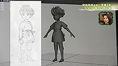 Comparée aux autres personnages, Ronya fait 1 mètre 20. A partir d'un gabarit générique de corps humain, on ajuste la longueur des bras et le volume du corps de ce modèle 3D sur la base des dessins de Kondô. On ajoute ensuite les cheveux et les vêtements. Une dernière étape importante : faire oublier l'aspect 3D en ajoutant un rendu cartoon à l'ensemble.