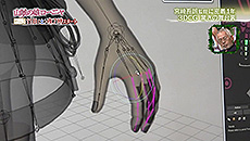 Vient ensuite l'étape du rigging, qui consiste à doter le modèle d’un squelette sommaire qui permettra par la suite de l’animer. Il s’agit d’une étape délicate, car si ces « points d'articulation » sont mals placés (ici, par exemple, l’épaule), les mouvements, au moment de l'animation, ne seront pas naturels. L’idée est de mettre ces articulations au plus proches de celles du corps humain. Aussi, l'équipe se réfère à des livres d'anatomie en permanence.