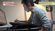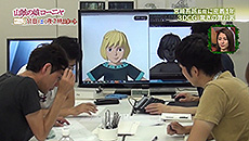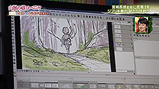 Gorô Miyazaki fixe un écran avec attention. Ca fait maintenant 6 ans qu'il s'intéresse au roman original Ronya, fille de brigand, et 2 ans qu'il travaille avec une nouvelle équipe sur les images numériques de la série. Il est satisfait.