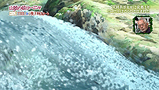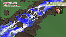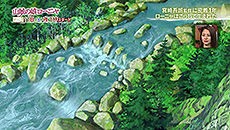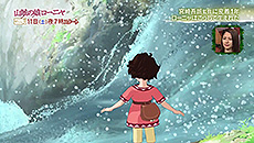Voici un autre exemple d'association de décor fait à la main et d’images numériques. Ici, pour que l'eau coule naturellement comme dans la nature, le superviseur des effets spéciaux, Yôhei Tanaka, crée des dénivellations sur son décor 3D. Il ajoute une simulation de l'eau sur ce décor. L'eau coule comme dans la nature. Enfin il ajoute le décor peint à la main. Enfin, pour accentuer encore plus le mouvement, il ajoute des éclaboussures.