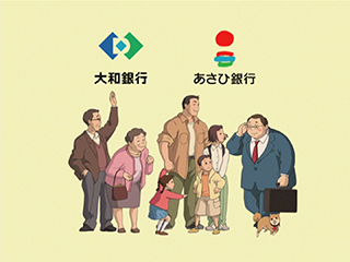 Publicités pour le réseau bancaire Resona, fusion de Daiwa Bank et Asahi Bank réalisée 3 mars 2003.