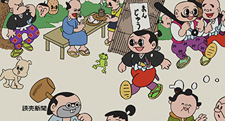 Publicités commémorant le 130ᵉ anniversaire du journal Yomiuri dans le style de dessins à l'aquarelle de Mes voisins les Yamada. Il montre les journaux de l'époque d'Edo (ou Tokugawa).