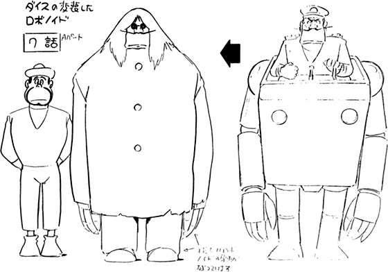 Si la Monsry définitive est l'archétype de la femme forte et combattante chère à Miyazaki, le capitaine Dice est de son côté l'incarnation de la crapule dotée cependant d'une conscience. Caractérisé de manière à donner vie à des situations paradoxales et comiques, Dice doit sa réussite à ses contradictions : assez peu de scrupules pour travailler pour Industria, mais capable de prendre ses distances avec la folie de Lepka ; cynique au point de sacrifier Conan au nom de son intérêt, mais prêt en même temps à lui porter secours ; pervers quand il fait de vulgaires avances à Lana mais assez sensible pour réveiller la féminité de Monsry, dissimulée par la dureté de sa condition militaire.