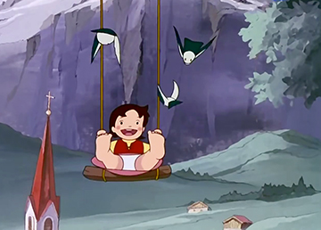 Prenons par exemple Panda, petit panda qui se passe au Japon. J’ai utilisé beaucoup de choses de la pré-production de Fifi, notamment des décors de l’intérieur de la maison et des personnages. J’ai fait apparaître la grande balançoire envisagée pour Fifi dans le générique de début de Heidi et je me suis référé à des éléments que j’ai vu à Visby pour la ville de Koriko dans Kiki, la petite sorcière (1989).