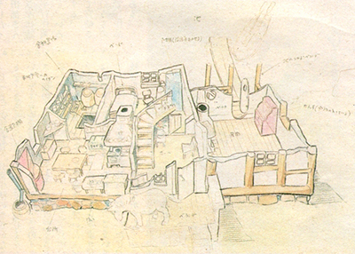 Avec ce plan dessiné, il aurait été plus facile de trouver l’orientation à prendre pour la mise en scène. Notamment pour Paku-san qui voulait obtenir une certaine précision : « le personnage marche de là-bas vers ici, la caméra bouge de cette façon, donc le décor sera comme ça... »