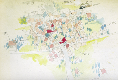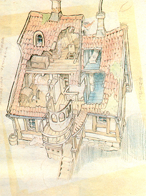 Extrait du plan d'ensemble de la ville où habite Fifi par Hayao Miyazaki.