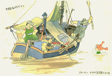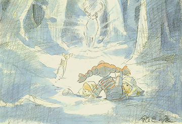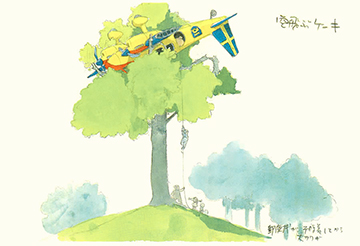 Le grand château, l’avion postal coincé dans un arbre, les braconniers qui pêchent des écrevisses et la rencontre avec un renne lumineux dans une forêt enneigée, pendant que j’avais encore du temps, j’ai dessiné toutes les choses qui me passaient par la tête en me disant qu’il y aurait toujours l’occasion de créer des épisodes avec. C’est tout. Pendant ce temps-là, Paku-san rédigeait une note d’intention qui ressemblait à une thèse. Je faisais ça en attendant...