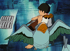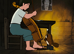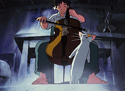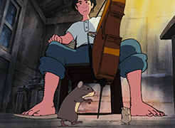 La quatrième nuit, une souris vient demander de l'aide à Gôshu. Son enfant, qu'elle a amené avec elle, est malade et la meilleure manière de le guérir est de lui jouer de la musique. Gôshu ne comprend pas comment la musique pourrait aider le rongeur. La souris lui explique alors que les animaux malades viennent sous le plancher du moulin l'écouter jouer et se ressourcer. Sa musique a déjà guéri la grand-mère du lapin, le père du tanuki, et même le vieux hibou. Réalisant les bienfaits qu'il procure, Gôshu ne peut plus refuser. Il place alors le souriceau dans la cavité de son violoncelle et commence à jouer. Après quelques minutes seulement, le petit va beaucoup mieux, au grand bonheur de sa mère. Avant que les souris ne rentrent, Gôshu leur donne un peu de pain et se réjouit d'avoir pu être utile.