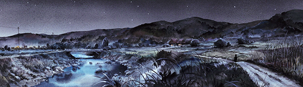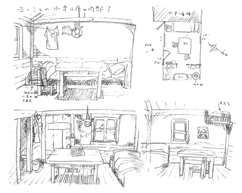 Mukuo a trouvé sa source d'inspiration dans un voyage à Gènes. Il a été marqué par les effets de lumière et a donc axé son travail sur les décors autour de cette préoccupation et de la notion de profondeur. L'atmosphère de Gôshu doit refléter un Japon rural, bercé par une lumière douce et par un élement essentiel, l'eau.
