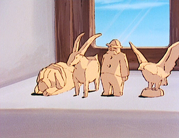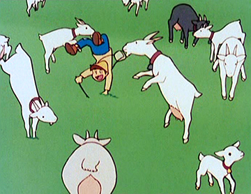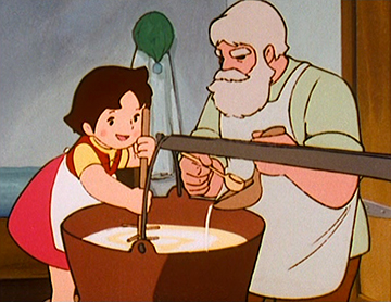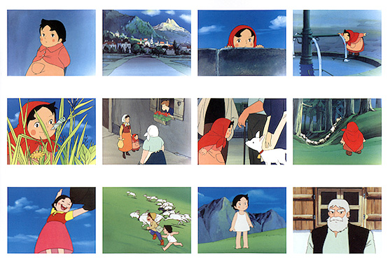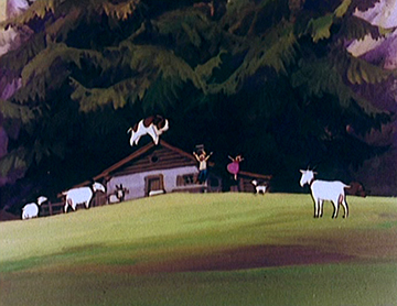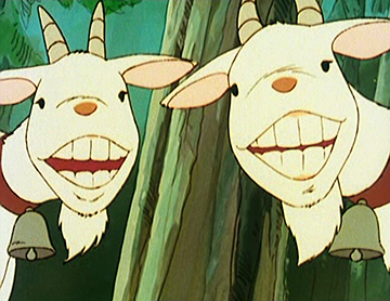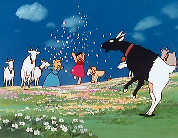 L’empreinte de Miyazaki à l’écran est donc indiscutable et plus particulièrement dans les multiples ruptures de tons ou exagérations de la série, telle la manière de Pierre de dévaler les montagnes ou d’engloutir avec voracité la nourriture, ou encore dans certaines sarabandes saugrenues des chèvres.