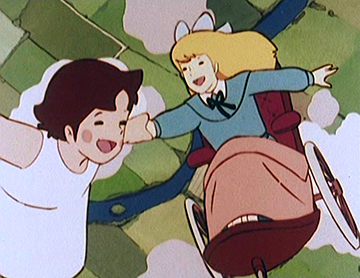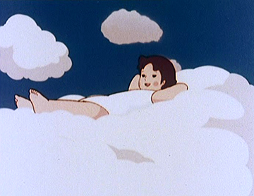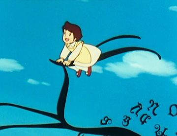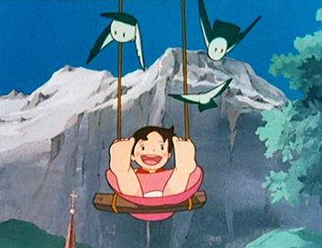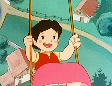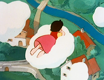 Le génériques de début met lui déjà en avant des envolées surréalistes : Heidi faisant des allées et venues au-dessus de la vallée sur une balançoire sans points d’attaches apparents, avant se jeter sur un nuage qui supporte son poids comme par miracle.