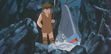 Tandis que Drago, le conseiller du chef du village, sème le doute et entretient la peur des villageois sur les pouvoirs magiques de la créature, les hommes du village réclament vengeance tandis que la veuve de Molas tente de calmer les esprits. Observant en retrait le désarroi des habitants du village, Horus décide d'agir seul et s'éloigne, armé de harpons, pour traquer le monstre.