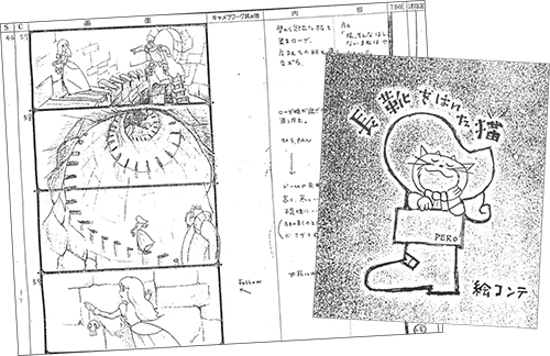 La direction de Kimio Yabuki laissait beaucoup de liberté aux dessinateurs. Le storyboard (le terme équivalent est l'e-konte au Japon) complet du Chat botté est justement un bon exemple de cette liberté puisqu’il a pour caractéristique d’être une compilation de storyboard dessinés par les principaux animateurs du film. C'est pourquoi la personnalité de Yasuji Mori, Yasuo Ôtsuka ou Hayao Miyazaki rejaillit très fortement dans certaines scènes du film.