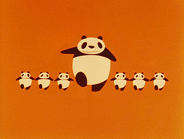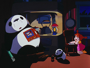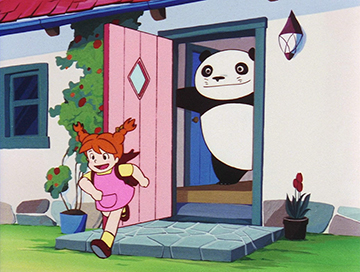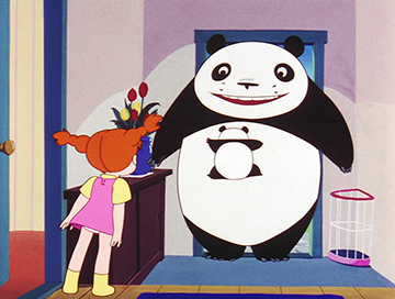 Alors que Mimiko et Pandy, petit nom donné par la fillette, boivent du lait à l’intérieur de la maison, un nouveau visiteur arrive. Il s’agit du père de petit panda. D’abord étourdie par la taille de l’animal, Mimiko l’invite à entrer pour boire avec eux, mais la chaise se casse sous le poids de l’animal. La petite fille lui installe à la place une grande rondelle de tronc d’arbre.