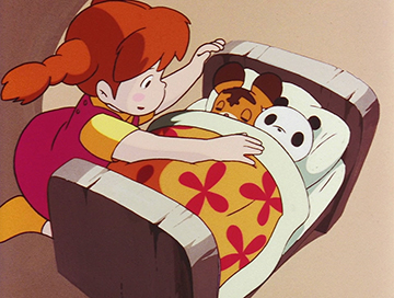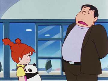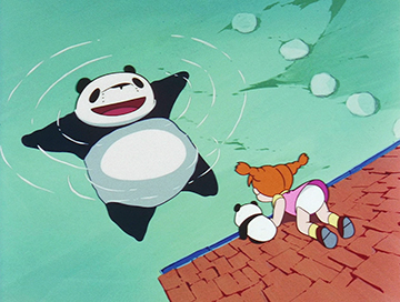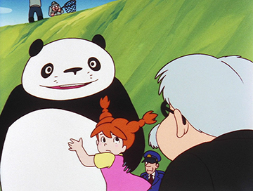 Le lendemain, un policier vient rendre visite à Mimiko. Il est stupéfait et effrayé de découvrir que la petite fille habite avec deux pandas, dont un qu’elle appelle « papa ». Il s’enfuit en courant, mais Mimiko ne s’en formalise pas et tous trois partent se promener au bord de la rivière. Pendant ce temps, la police et des employés du zoo ont investi la maison pour tenter d’attraper les pandas et les ramener au zoo.