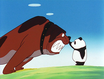 Mimiko et « sa famille » sont en train de jouer à la corde à sauter lorsque deux voyous arrivent avec un molosse. Quand ils aperçoivent les pandas, ils pensent immédiatement à la récompense promise à ceux qui les retrouveraient. Pendant que l’un des enfants court chercher la police, l’autre reste pour les surveiller avec le chien. Mais le chien s’énerve et échappe à son maître. Il menace d’abord Mimiko, mais Papa panda, placide, le fait reculer simplement en ouvrant grand sa bouche. Le chien se reporte alors sur Pandy et lui saute à la tête. Mais le petit panda a la tête dure et, malgré sa petite taille, est déjà d'une force herculéenne. Tranquillement il saisit le molosse et le projette contre son maître. Les deux s’enfuient à toutes jambes.