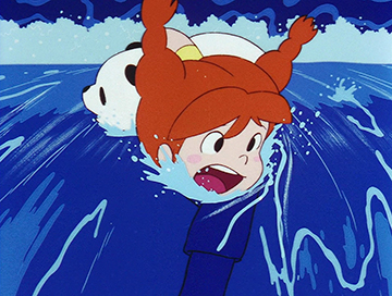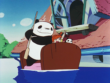 Un policier l’aperçoit enfin sur une planche de bois dérivant sur la rivière. Mais il s’approche dangereusement du barrage. Mimiko n’hésite pas à sauter du haut du barrage pour le saisir avant qu’il ne bascule dans la chute d’eau. Elle s’accroche à un rebord, mais n’a pas la force de résister longtemps. Heureusement Papa panda parvient à fermer le barrage à temps. Tout le monde saute dans l’eau pour fêter le sauvetage réussi de Pandy.