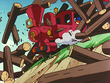 Malheureusement, il arrive à la fin de la voie ferrée. Défonçant la barrière de troncs d’arbres, il continue à rouler en dehors des rails. Il dévale puis remonte une pente, traverse la forêt puis la ville devant les habitants stupéfaits.