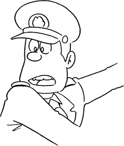 Bon policier, même s’il ne doit pas avoir un travail difficile puisque qu’il n’y a jamais aucun acte de malveillance dans sa ville. Il prend systématiquement des nouvelles de Mimiko car il sait qu’elle vie seule depuis le départ de sa grand-mère. C’est d’ailleurs en lui rendant visite qu’il découvre les deux pandas et donne l’alerte.