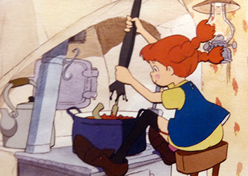 Les croquis préparatoires pour Fifi Brindacier signés Yôichi Kotabe démontrent un véritable désir de mettre en avant la vie quotidienne à travers ses menues tâches et des activités courantes et anodines.