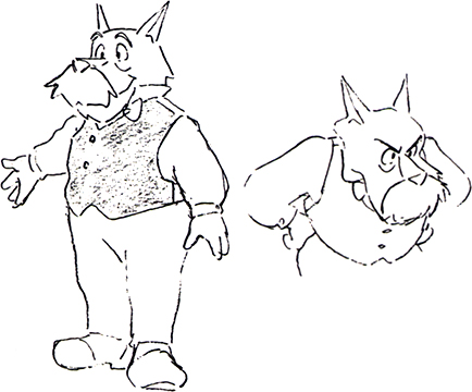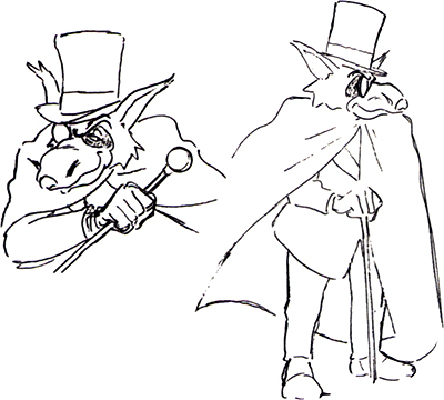James Moriarty est le seul, avec Sherlock Holmes, à ne pas être représenté par un chien ! En effet, le célèbre ennemi de Sherlock Holmes est ici figuré sous les traits d’un loup d’âge mûr, habillé d’un costume et d’une longue cape blanche, portant canne, monocle et chapeau haut-de-forme. Moriarty se veut en effet être un gentleman cambrioleur, élégant et raffiné. Mais contrairement à son homologue Arsène Lupin, tous ses plans échouent systématiquement, à cause notamment de Sherlock Holmes. Il faut dire que Moriarty est (presque) derrière tous les sales coups, du plus basique au plus farfelu.