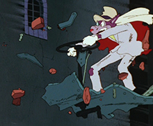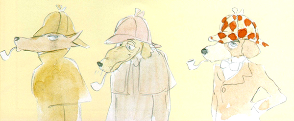 Concernant le character design, on remarque une véritable recherche dans les traits des personnages. Bien qu’il s’agisse de canidés, les personnages ont un physique immédiatement reconnaissable, qui reflète parfaitement leur psychologie. Dans la filmographie de Hayao Miyazaki, il est rare de voir cet anthropomorphisme. On peut d’ailleurs remarquer que le réalisateur avait initialement représenté Madame Hudson sous des traits humains, ce que la RAI a refusé catégoriquement. Le choix de représenter des animaux possède évidemment l’avantage d’attirer un public jeune et le cas de Sherlock Holmes est loin d’être unique dans l’animation. Disney est évidemment la référence de ce type de character design, et le personnage de Sherlock Holmes n’est d’ailleurs pas sans rappeler celui de Robin des Bois. Quant à Moriarty, il est parfaitement dans la lignée des Grands Méchants Loups complètement dingues de Tex Avery.