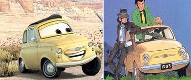 Signalons aussi que l'adaptation des films des studios Ghibli est supervisée pour la version américaine par les pontes de Pixar comme vous pouvez le découvrir dans les bonus du DVD du Château Ambulant sorti en janvier dernier dans les bacs. C'est donc tout naturellement que John Lasseter a inclus dans son dernier film un clin d'oeil à son ami Miyazaki. Dans Cars , on peut y voir un personnage secondaire répondant au nom de Luigi, une voiture de modèle Fiat 500, fan de Ferrari. Il se trouve que c'est le modèle que conduisait Lupin III / Edgar dans le film réalisé par Miyazaki dans sa période pré-Ghibli, Le Château de Cagliostro.
