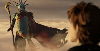 Il y a plusieurs scènes dans Dragons 2 qui font penser au génie de l'animation japonaise. Les moments de glisse entre l'Azur et les nuages, les monstres marins qui ressemblent aux Yokais de Chihiro ou, encore mieux, la plus belle scène du film, l'apparition fantasmatique d'une guerrière remontée des âges obscurs qui traversent les nuages pour rejoindre le héros... Harold chevauche Krokmou, s'allonge sur le dos de son dragon et voit sortir des nimbes une figure infernale, un masque primitif en suspension qui émerge quelques instants, puis s'enfonce dans la ouate crémeuse avant de réapparaître plus menaçant. Secondes silencieuses, inquiétantes qui encapsulent la beauté de ce film fabuleux. Le contraste entre la violence de la plastique amazone (oui, il s'agit d'une femme) et la douceur qu'elle va révéler sous le masque, ce moment de suspension, la beauté aquarellée des images… Impossible de ne pas penser à Miyazaki dont les films sont toujours placés sous les signe d'un féminisme puissant. Pas un féminisme sentimental, mais, comme ici, politique et psychologique.