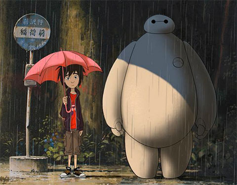 Le robot Baymax du film de Disney Big Hero 6, avec sa rondeur et sa bonhommie, fait penser à Totoro. Jin Kim, superviseur de la conception des personnages aux Walt Disney Animation Studios, qui a travaillé sur la conception des personnages de Big Hero 6, a clairement indiqué sur son blog personnel qu'il était un fan du Studio Ghibli. Il a confirmé son inspiration avec cette illustration plaçant les deux héros deBig Hero 6 dans la célèbre scène de l'arrêt de bus de Mon voisin Totoro.