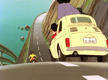 Pendant une scène de course-poursuite en voitures, l’épisode 16 de la première série de Lupin III / Edgar de la cambriole donne au spectateur une nette impression de se retrouver devant la forme primitive de la cultissime scène qui ouvre Le château de Cagliostro, le premier long métrage de Hayao Miyazaki.
