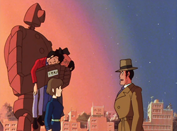 C’est au tout début des années 80 que Hayao Miyazaki réalise les épisodes 145 et 155 de Shin Rupan Sansei, la seconde série de Lupin III / Edgar, le détective cambrioleur. Le deuxième, intitulé Saraba Itoshiki Rupan yo (Adieu, Lupin bien-aimé), qui marque la fin de cette longue série, met en scène avant l’heure deux personnages bien connus du réalisateur qui sèment la pagaille à Tôkyô : un robot-guerrier de l’île volante de Laputa (dans l’épisode, un robot-voleur) piloté par Nausicaä !