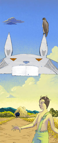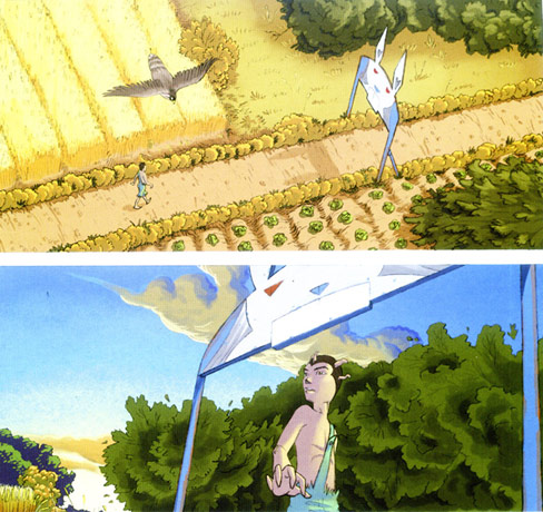 Quant à savoir si je suis influencé par le travail de Miyazaki, concrètement, je ne pense pas dans la forme, même si je ne peux m'empêcher de mettre des "clins d'yeux" dans mes albums. Cependant, j'ai beaucoup d'estime pour son amour des choses et sa vision. Pour moi, ça c'est un exemple à suivre. Et puis savoir si ce grand artiste a encore des choses à dire... Il y a toujours la crainte qu'un grand maître finisse par radoter. Mais un vieux cochon comme lui doit avoir encore bien des idées qui traînent et des pistes inexplorées. Miyazaki est un raconteur d'histoires avant d'être un dessinateur, contrairement à Otomo par exemple qui raconte toujours la même chose au final... Et un Miyazaki sera toujours meilleur qu'un Disney. Même en 3D. ^^ En plus il faudrait aussi parler de Suzuki, l'homme de l'ombre et sans lui, les studios Ghibli n'existeraient pas aujourd'hui. Les producteurs comme lui sont rares. Il sait juger du travail de Miyazaki et si ça cloche il sait le lui dire ! Tant que Toshio Suzuki sera derrière les studios on peut parier qu'il y aura encore de bons Ghibli. Et puis il y a Morita qui est là pour poursuivre l'esprit des deux maîtres. Ce gars est jeune et il va progresser !