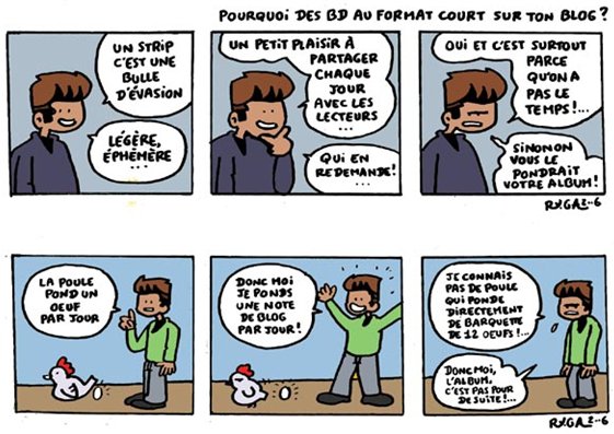 Le Blog et ses strips quotidiens, c'est au minimum un rendez-vous par jour avec les lecteurs. C'est au format court parce que d'abord comme j'ai un boulot plein temps j'en ai peu (du temps). Ensuite le dessin est souvent une bulle d'évasion qui se réalise assez vite. Enfin pour ce média qui est le blog on a tout intérêt à faire court et intense pour des raisons d'efficacité.