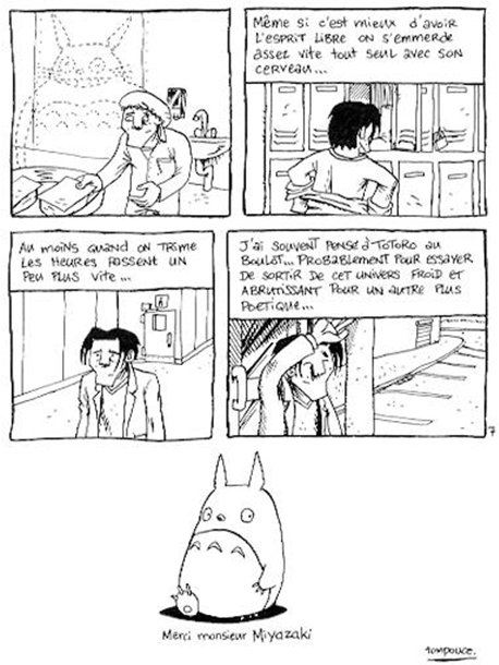 Depuis, c'est la cohérence du propos, l'univers poétique et le message écolo/pacifiste de Miyazaki qui m'intéressent le plus. J'ai vu tous les long-métrages Ghibli et la plupart des séries TV sur lesquelles ont travaillé Isao Takahata et Hayao Miyazaki avant de créer le studio. A 20 ans j'ai pleuré pour la première fois devant un film en visionnant Le tombeau des Lucioles et à mes yeux, ce n'est pas une mince affaire pour un garçon. Mes films préférés de Ghibli sont Mon voisin Totoro, pour son histoire d'une simplicité exemplaire, bourrée d'émotion, et Laputa pour son coté épique et virtuose, dont je trouve la narration parfaite. Quant à savoir si je me sens influencé par les films Ghibli... Je dirai que le travail de Miyazaki remporte ma faveur en tant que spectateur, ses histoires font partie de moi désormais, mais il n'y a pas d'influence directe de son travail sur le mien.