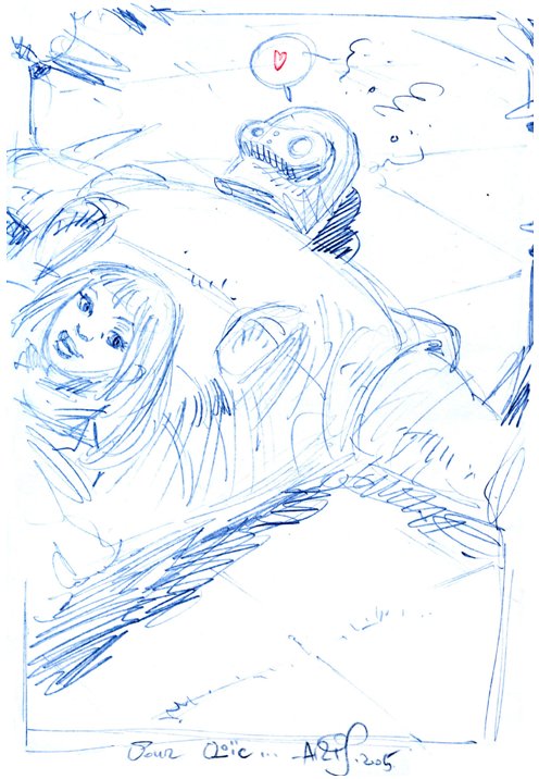 Je remercie donc Gilles Aris car sans lui, j’aurais été privé en tant que lecteur d’un petit joyau (mais j’en ai déjà dis le plus grand bien par le passé alors vous le savez déjà !). Tandis qu’il accepte de me dessiner le robot de Laputa, je lui demande si il a été marqué par Totoro.