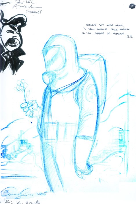 Il me conseille de regarder certaines BD car des clins d’œil Totoro se cachent dans les cases. Gnark gnark, il ne sait pas à qui il parle ! Je souris et lui sors de mon sac le dossier de noël spécial Bd Ghibli (devenu l’encyclopédie évolutive) imprimé que j’ai emmené avec moi pour le donner aux auteurs qui avaient bien voulu répondre à mes questions. Il le lit pendant que Buscaglia fait un croquis sur mon album Greenpeace.