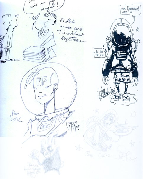 La conversation s’oriente assez rapidement sur le boulot que je pratique (oui, cet auteur pose des questions sur le sujet à tous ses lecteurs) puis sur son style de graphisme qui à l’origine était plutôt réaliste lorsqu’il faisait Petit Verglas chez Delcourt, puis totalement humoristique. Il me demande quel type de dessin je préfère. Je lui réponds par une question, à savoir s’il aurait pu faire Les pauvres aventures de Jérémie avec un dessin réaliste ? Il me dit que l’humour aurait sans doute moins bien fonctionné avec un dessin hyper chiadé dans lequel il est de toute façon moins à l’aise...