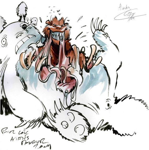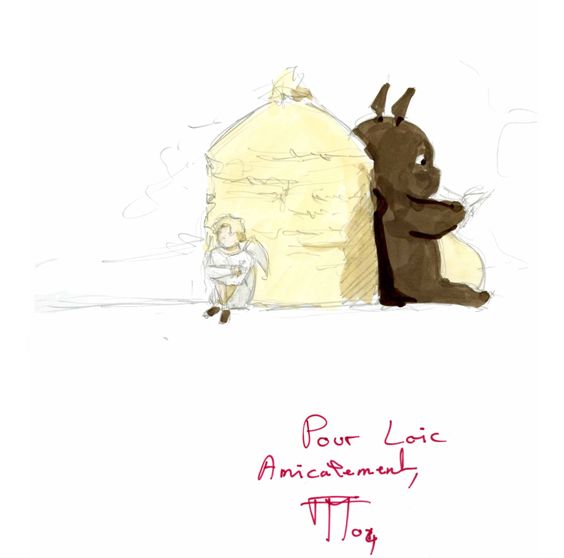 Le temps passe, Guilhem revient fréquemment me voir car je m'ennuie un peu. Mais bon, j'ai vraiment envie que Mourier me fasse un Totoro alors je compte mes poils sur les doigts pour que ça passe plus vite. Quand je lève la tête, les sacs et les valises devant moi ont retrouvé leurs propriétaires et je comprends : les « professionnels » de la file Tarquin, une fois leur dessin fait, rejoignent ma file pour attendre Mourier. Je me dis que c'est pas glop et pas poli mais en les entendant parler entre eux, je m'abstiens de tout commentaire. Ben oui, je comprends très vite que ce sont de gros cons. En les écoutant, je saisis que ces messieurs avec un fort accent belge sont des arpenteurs de festivals. Ils se déplacent pour des auteurs « cotés », des « gros », comme ils disent, et ils énumèrent leurs derniers trophées respectifs. C'est ce genre de type qui garnit ensuite les sites comme Ebay, d'albums bds dédicacés, vendus à des prix écœurants. Extension du domaine de la bêtise... Je me dis qu'il y a une thèse à écrire sur ces gens-là lorsque la marmotte arrive avec Julia, Cyril et Olivier.