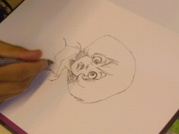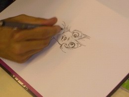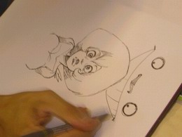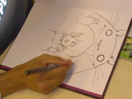 Il arrive enfin, nous regarde avec un grand sourire sympathique et émet de bonnes grosses phéromones de gentillesse tout en se mettant au travail. Ce qu'il fait est très beau. Très très beau même. Cependant, le fait que tout le monde lui demande à chaque fois les mêmes personnages renforce mon envie de lui demander de mettre en scène la rencontre improbable de Noa et Totoro. Mais je ne m'y résous pas totalement car je n'aime pas importuner les gens et là, l'air de rien, ça lui demande de me dessiner deux personnages (habituellement il n'en fait qu'un), dont un qu'il n'a pas l'habitude de faire. Wait and see...