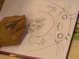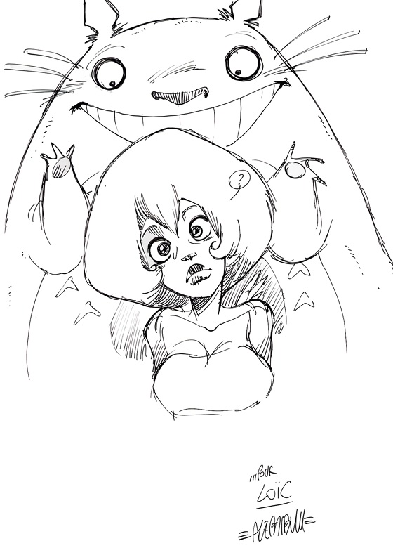 Vendredi 13 juin 2003, j'arrive à 09h00 au salon de Paris-bd, porte de Versailles. Dès l'ouverture, je me rends au stand de dédicace Soleil et grand bien me prend car ils sont déjà une douzaine à patienter. Dans l'attente du maestro, je me plonge dans mon Sky Doll 0 et là quelle joie de constater que Barbara Canépa et Alessandro Barbucci sont de fervents admirateurs de Miyazaki. En effet, grâce à un petit tableau en fin d'ouvrage, j'apprends que leurs films d'animation préférés sont respectivement Mon voisin Totoro et Le voyage de Chihiro. Ils ont bon goût ces gens là. C'est à ce moment-là que commence à germer l'envie de demander un dessin alliant l'univers de science-fiction de Sky Doll et celui merveilleux de Totoro. Deux problèmes cependant : rien ne me garantit que je tombe sur un gars sympa qui se prêtera au jeu, et en plus, je n'ai pas parlé italien depuis près de trois ans, or Alessandro Barbucci ne parle que très peu le français.