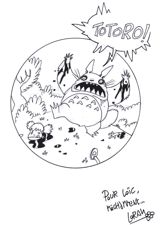 Amis du trash, bonjour ! Sur le stand du cycliste se tient l'auteur du gorissime Bouyoul ! Cette série narre les aventures d'une espèce de Tamagoshi qu'une fée complètement bourrée va faire apparaître dans le monde réel. Copain des enfants, ce drôle de monstre atrocement lunatique peut à tout moment décider que leurs viscères sont plus à leur place autour de leur cou et que leur cerveau est plus utile hors de leur crâne. Le plus amusant, c'est que le graphisme coloré et rond de Loran ne laisse pas présager une seule seconde de la jubilante boucherie qui se terre dans l'album... Avec cette description, vous imaginez forcément que Totoro dessiné par cet auteur risque de subir quelques petits changements de personnalité... Vous aviez raison :
