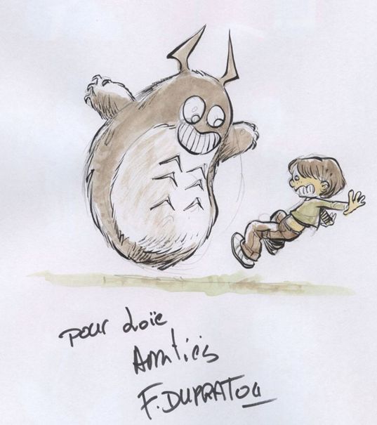 Et ma dédicace dans tout ça ? Bin, même si dans ce contexte c'est absolument secondaire, je dois dire que quand elle arrive, je la trouve fort rigolote, car très différente de la précédente. Notez que pour une fois, je n'ai pas demandé de Totoro mais que l'auteur a pris seul l'initiative de m'en faire un. Il doit vraiment me prendre pour un monomaniaque...